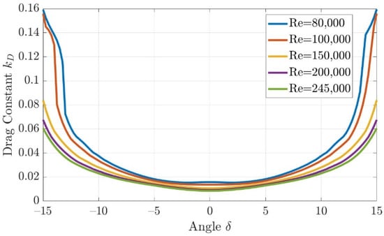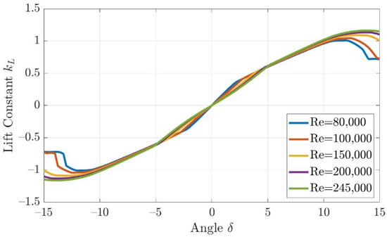 Through calculation, the Reynolds number of the fin and rudder lies around 80,000 to 245,000, and the Xfoil prediction outputs the lift and drag constants with respect to turning angles and the results are shown in Figure 7 and Figure 8.