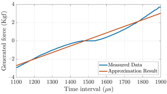 The fixed thruster on the discussed torpedo-like underwater vehicle is the T200 Thruster made by the Blue Robotics company. This thruster was controlled by the time interval of input square signals, and the company provides practical test data of the thruster and illustrates the relation between the input time interval and the output generated forces as in Figure 9.
