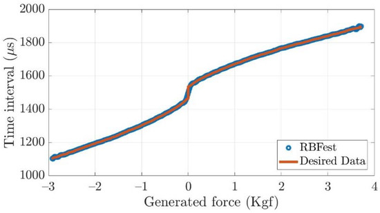 A more precise way to approximate the thruster model is using a radial basis function network to approximate the relationship between the input PWM signals and the generated forces as . From Figure 10, it is easy to find out that the proposed radial basis function network can precisely approximate the behavior between input and output of the thruster. The detailed derivation is given in Appendix A. Through setting the inputs as measured generated forces and outputs as PWM signals, then a radial basis function network can be constructed to continuously calculate PWM signal when the control allocation gives the generated force that the thruster should produce.