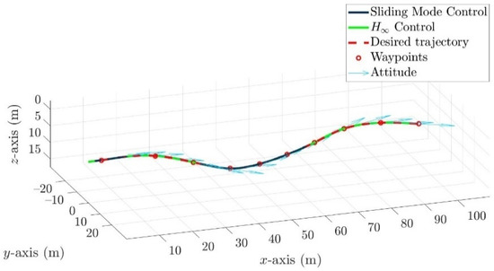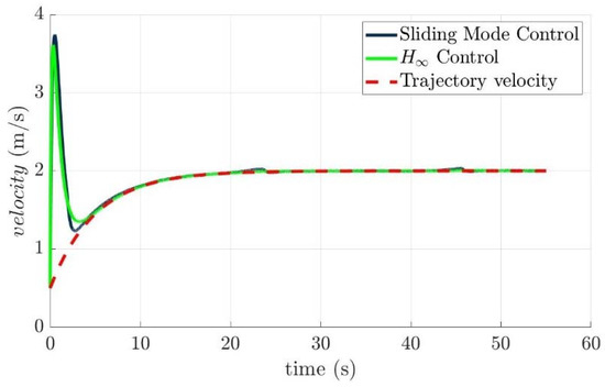 In this simulation, the developed torpedo-like underwater vehicle was controlled by the H∞ control law in Equation (2) and a sliding mode control, respectively. The tracking histories are illustrated in the following picture. The red dashed line is the desired trajectory, the green line is the tracking result of the nonlinear H∞ control law, and the blue line is the tracking result of the sliding mode control law. From Figure 11, the controlled torpedo-like underwater vehicle precisely tracks the desired trajectory with a steady state velocity 2 m/s.