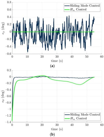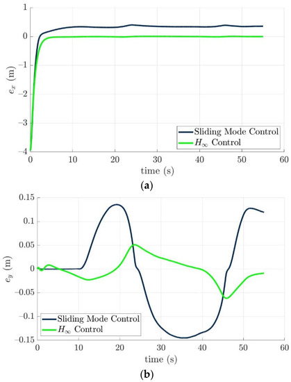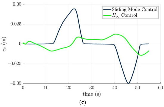 The tracking errors of the controlled torpedo-like underwater vehicle are shown in Figure 12 and Figure 13. Obviously, there is an initial offset of −3.95 m between the first waypoint and the controlled torpedo-like underwater vehicle in the x-axis, and this position error converges to near zero exponentially. From Figure 12, the nonlinear H∞ control law outperforms the sliding mode control in position tracking ability. In addition, attitude tracking errors with respect to pitch and yaw directions of the controlled torpedo-like underwater vehicle converged quickly and bounded within ±0.5° in a steady state for two control laws, even as it was directly affected by induced forces and torques of time-varying ocean currents, and the sliding mode control law has better tracking performances in pitch and yaw directions.