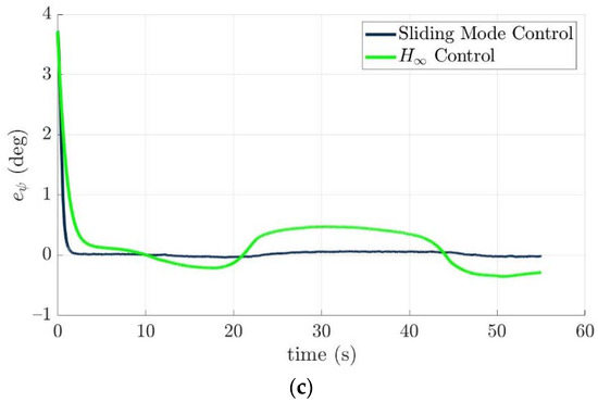 Histories of the attitude tracking errors of the torpedo-like underwater vehicle: (a) roll direction, (b) pitch direction, and (c) yaw direction.