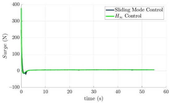 Surge forces of the developed torpedo-like underwater vehicle with respect to the sliding mode control law and the nonlinear H∞ control law.