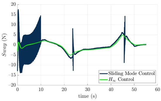 Sway forces of the developed torpedo-like underwater vehicle with respect to the sliding mode control law and the nonlinear H∞ control law.