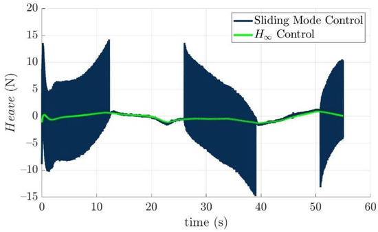 Heave forces of the developed torpedo-like underwater vehicle with respect to the sliding mode control law and the nonlinear H∞ control law.