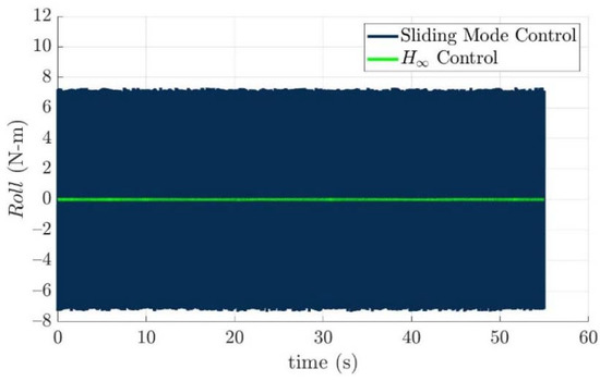 Roll moments of the developed torpedo-like underwater vehicle with respect to the sliding mode control law and the nonlinear H∞ control law.