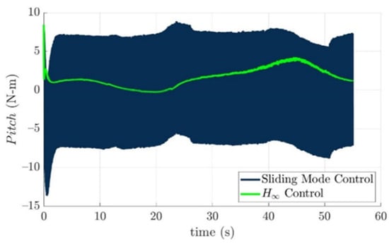 Pitch moments of the developed torpedo-like underwater vehicle with respect to the sliding mode control law and the nonlinear H∞ control law.