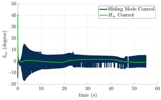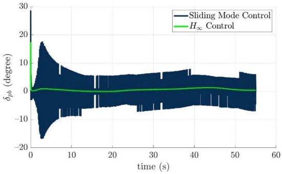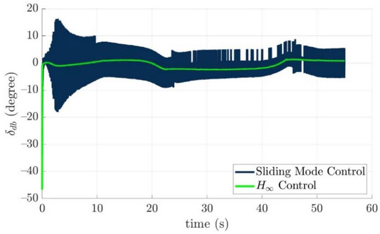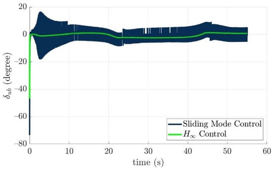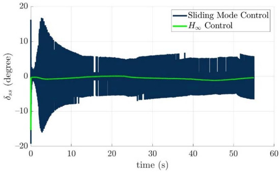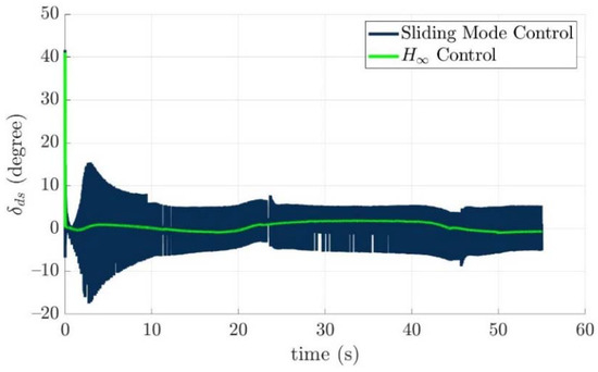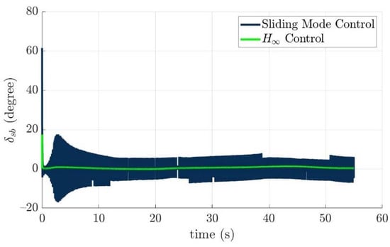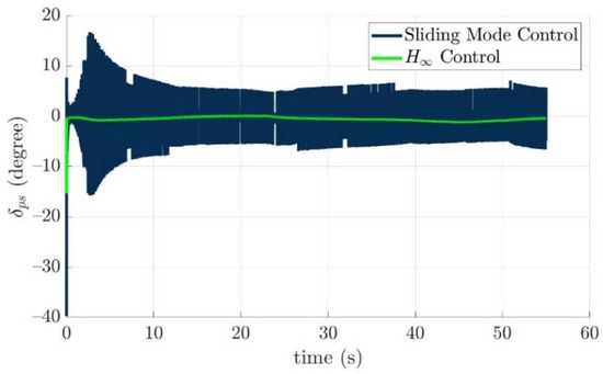 The starboard stern fin angles of the controlled torpedo-like underwater vehicle for two control laws, respectively.