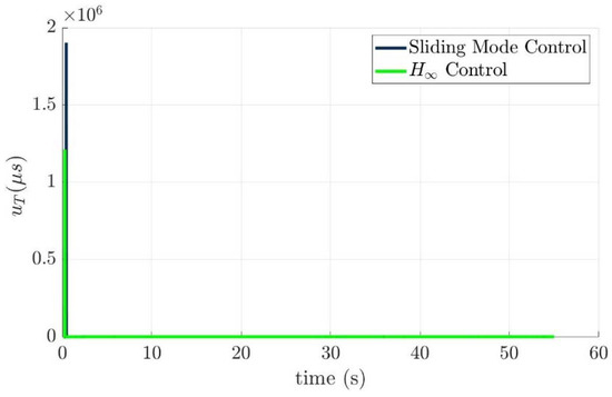 The desired control forces that precisely guide the developed torpedo-like underwater vehicle to track the desired trajectory based on the sliding mode control law and the nonlinear H∞ control law are illustrated as Figure 15, Figure 16, Figure 17, Figure 18, Figure 19 and Figure 20. These figures reveal the facts that control forces and torques generated by the sliding mode control law to guide the torpedo-like underwater vehicle are larger than those of the nonlinear H∞ control law during the trajectory tracking period.