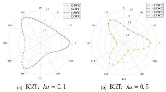 Polar plot of stress concentration of BCZT at different incident wavenumbers and temperatures.