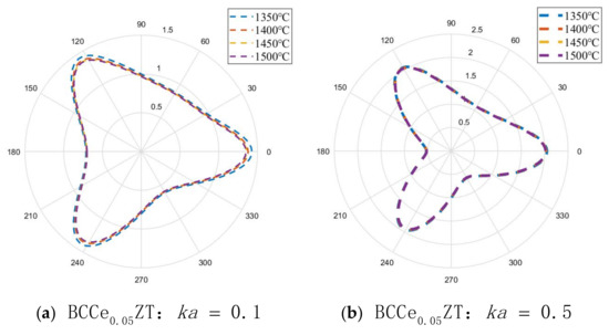 For this case study, it is possible to evaluate the stress for a steady-state elastic wave incident along the x-axis and parallel to the deflection angle of the triangular defect (alpha = 0); see Figure 1. According to the dynamic stress concentration formula derived above, the dynamic stress concentration will change with the wave number of the incident elastic wave and the piezoelectric constant of the material. By adjusting the dimensionless wave number ka of the incident wave, the dynamic stress concentration factor at different temperatures and Ce doping amounts are shown in the following Figure 3, Figure 4, Figure 5, Figure 6 and Figure 7.