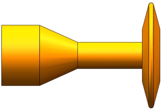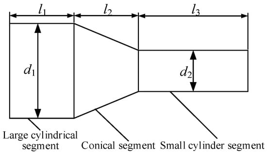 The conical transitional composite horn was designed based on the equivalent four-terminal network method. Due to each segment of the composite horn being equivalent to a mechanical four-terminal network, then an overall four-terminal network transmission matrix could be obtained by each transmission matrix multiplied continuously. Finally, under the given boundary conditions, the material size parameters of each segment of the composite horn were substituted into the overall transmission matrix to obtain the length l3, the small cylindrical end of the horn, as shown in Figure 1 and Figure 2.