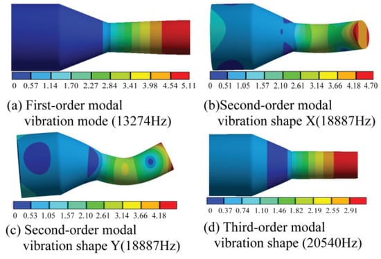 The mode shapes of the composite horn from 18 kHz to 22 kHz were extracted, and the result is shown in Figure 3. In the first-order modal vibration mode, the radial vibration occurred in the small cylindrical section, and the radial displacement at the end was the largest. The two modal shapes (X and Y) corresponding to the second-order modal natural frequencies were the bending vibration, but the directions of bending vibration were different. The third-order modal vibration mode was the longitudinal vibration mode required for the design. The longitudinal vibration frequency was 20,540 Hz, which was close to the theoretical design value of 20 kHz, indicating that the structural design of the composite horn was reasonable.