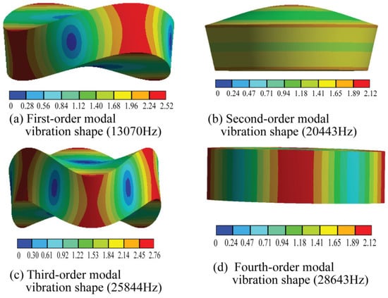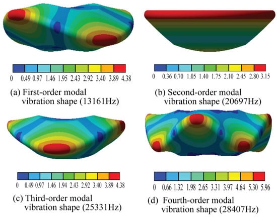 The radius and thickness of the disc were 40 mm and 20 mm, respectively. The disc’s material was the same as that of the composite horn, which was stainless steel 316 L, and the relevant material parameters are shown in Table 1. The first-order longitudinal vibration frequency of the disc was 20.228 kHz, which was calculated by bringing the above parameters into Equation (7). The modal analysis of the theoretically designed thick disc was carried out to extract the first four modal vibrations in the range of 10–30 kHz for the thick disc, and the results were shown in Figure 4. It is worth noting that each of the first three orders of vibrations generates bending vibrations differently. The second-order vibration mode was the bending mode of the disc along the axial direction, which is the required pattern for the design, with an inherent frequency of 20,443 kHz. The fourth-order vibration mode showed that the disc vibrated along the radial direction.