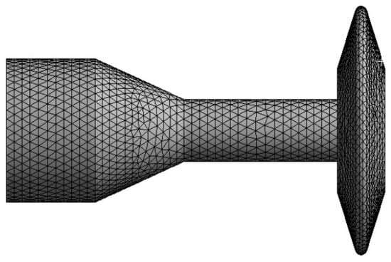 Finite element analysis was used to explore the effect of the geometry of the rotating wheel on the dynamic characteristics of the L-BCH. The 3D model was first imported into the workbench (Figure 7), and then meshes were created (Figure 8). The frequency range was set from 15 kHz to 25 kHz in solving the vibration modes. The finite element software could be used to obtain the inherent frequencies under longitudinal-bending vibration. Further, based on the modal analysis, a vibration displacement of 2 μm was applied to the left end of the composite horn. The number of analysis steps was set to 30; then, the harmonic response analysis of L-BCH was performed by the modal superposition method. Finally, the amplitude-frequency response curve of L-BCH was obtained, allowing the amplitude of the wheel edge under longitudinal bending vibration mode to be determined.