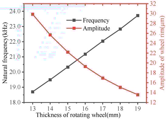 When taking no other structural parameters into account, the thickness of the spinning wheel was taken as 13 mm, 14 mm, 15 mm, 16 mm, 17 mm, 18 mm, and 19 mm, respectively. Figure 9 shows the modal analysis and harmonic response analysis of the L-BCH. As the thickness of the spinning wheel increased, so did the L-BCH natural frequency. In contrast, the amplitude of the wheel’s rim gradually decreased as its thickness increased. However, the rate of amplitude changed with thickness decreases. Thus, the thicker a spinning wheel was, the less impact it had on amplitude.