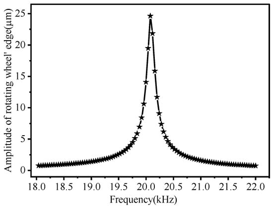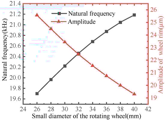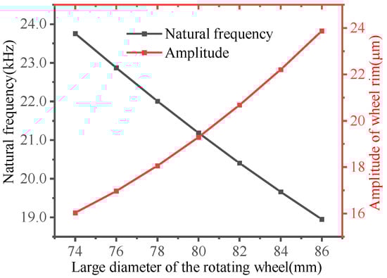 The diameter of the rotary wheel was taken to be 74 mm, 76 mm, 78 mm, 80 mm, 82 mm, 84 mm, and 86 mm to obtain the relationship between the diameter of the rotary wheel and the dynamic characteristics of the L-BCH. Analyses were carried out on the L-BCH in modal analysis and harmonic response analysis. The results are presented in Figure 10. The natural frequency of the longitudinal-bending vibration mode of the L-BCH decreased gradually with the increasing diameter of the wheel. However, the amplitude of the wheel rim increased gradually. Therefore, we can conclude that the L-BCH’s natural frequency and amplitude were influenced oppositely by the large diameter and thickness of the rotating wheel.