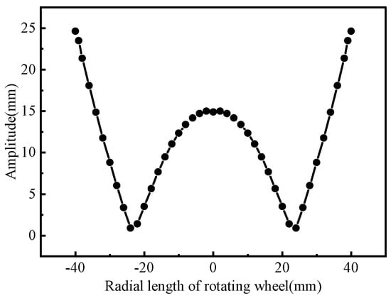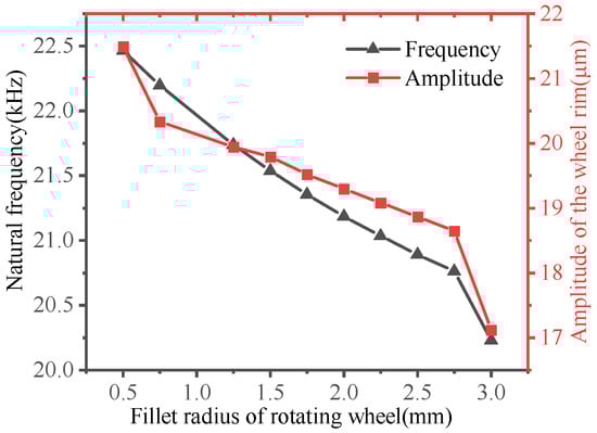 It is evident in Figure 12 that both the natural frequency and amplitude decreased with increasing the rotating wheel fillet radius. The natural frequency of the longitudinal-bending vibration mode decreased from 22,463 Hz to 20,229 Hz as the radius of the fillet increased from 0.5 mm to 3 mm, and the amplitude of the wheel rim decreased from 21.494 μm to 17.121 μm. Compared with other structural parameters of the rotating wheel, the radius of the roller fillet had less influence on the amplitude of the wheel rim.