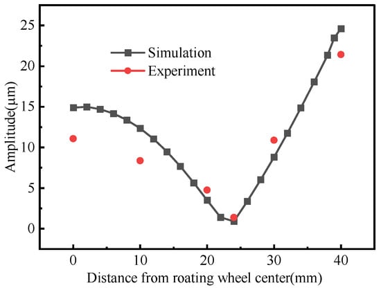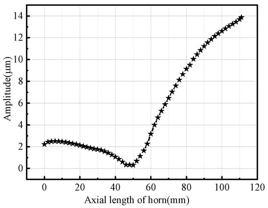 Results of the analysis indicated that the second-order vibration mode of the optimized L-BCH was required for the design; 20,069 Hz was the natural frequency of the second-order longitudinal vibration mode, which was very close to the theoretical value of 20 kHz. It indicates that the structural design of the horn was reasonable because the amplitude of the wheel rim reached a maximum of 24.627 μm at 20,069 Hz. An axial amplitude was extracted along with the axial direction of the horn, and a radial displacement was extracted along with the radial contour of the wheel. These results are shown in Figure 15 and Figure 16.