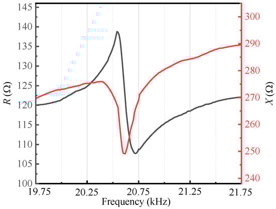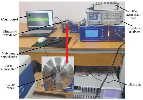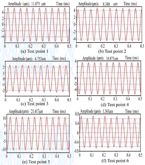 Firstly, the transducer’s impedance is measured with an impedance analyzer, as shown in Figure 19, which shows that its resonant frequency is 20.51 kHz. After that, a laser vibrometer and an ultrasonic power supply are used to measure the vibration characteristics of this giant magnetostrictive transducer. The signal collected is fed back to the PC through the NI data acquisition card. Because of the symmetrical nature of the wheel, we chose six positions as the measuring points, which are 0, 10 mm, 20 mm, 30 mm, 40 mm, and 24 mm, respectively, from the center of the wheel and marked as 1, 2, 3, 4, 5, 6 one by one. A resonant state is achieved by adjusting the excitation frequency of the ultrasonic power supply. After that, the measured point’s amplitude is determined. The average value is calculated based on three measurements. When the excitation frequency of the ultrasonic power supply is 20,515.6Hz, it can be observed that the vibration velocity of the measured points on the spinning wheel approaches maximum. Hence, these results show that the L-BCH can resonate at a frequency close to the simulation resonant frequency, suggesting that it has been designed correctly. Figure 20 shows the amplitudes of six measured points at resonant frequencies. The comparison between simulation and experiment at each point is shown in Figure 21.