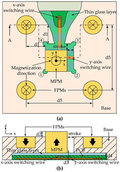 In the previous study [23,30], research on the actuators optimization design were carried out; a double side Printed Circuit Board (PCB) was used to avoid any electrical contact between the two orthogonal wires (Figure 1). A thin glass layer was placed between the MPM and the PCB so as to avoid electrical contact between the MPM and the wires. This thin glass layer also ensures a flat surface on which the MPM moves. The dimensions and the properties of the actuator are given in Table 1.