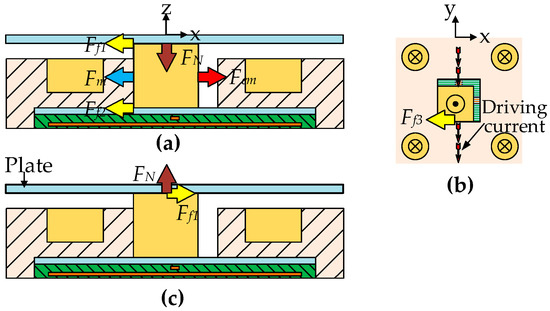 During the movement of the device, the forces exerted on each actuator and the plate constantly changed with the position change of the plate and each MPM in the device. Four different types of forces were considered in the dynamic model: the electromagnetic force () between the current-carrying wires and each MPM, the magnetic force () between FPMs and MPM, the friction forces (, , ) between the moving components and the fixed components and the supporting force () between the MPMs and the conveyed plate. (Figure 3)