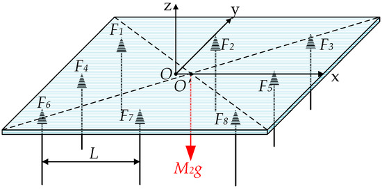 The calculation of the supporting forces can be expressed with Figure 5 and Equations (9)–(11). In Figure 5, are the supporting forces exerted on the plate by the 8 MPMs, respectively, O is the calculation coordinate center, O’ is the centroid of the plate.