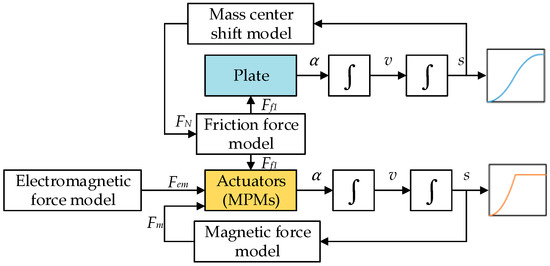 The abovementioned four sub-models have been integrated in a device dynamic model. This model was realized in MATLAB/Simulink and the block diagram of the proposed model is shown in Figure 6. During the simulation, the position information of each MPM and the conveyed plate were fed back to the magnetic force model and the mass center shift mode, respectively. The simulation results are presented in the following Section.