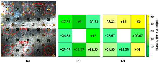 (a) Experimental Prototype made of aluminum. (b) Manufacturing errors along x-axis of the square cavities. (c) Manufacturing errors along y-axis of the square cavities.