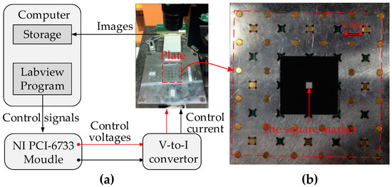 A non-contact measurement technique based on high frequency capturing camera (FL2-08S2M/C) and a MATLAB image processing program have been developed and implemented, respectively to achieve the plate displacement value. A square marker is pasted at the center of the glass plate surface (Figure 8b) as a position marker for the measurement. The camera is controlled to take pictures of the plate and transfer pictures to the computer during the displacement of the plate. The stored pictures are processed and calculated by MATLAB program to obtain the displacement of the conveyed plate. The resolution of the camera is 10.42 μm/pixel.
