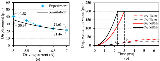 It can also be observed that with the increase in the driving current value, the experimental and simulation SSD values of the plate decrease from 40.88 μm to 21.61 μm and 35.96 μm to 21.46 μm, respectively. This phenomenon can be explained via a dynamic simulation analysis of MPM. Thanks to the device dynamic model mentioned above, time-displacement curves of MPM and plate during one SSD have been simulated and presented in Figure 9b. Two driving current values (5A and 7A) are used to make it clear to analyze. Points a and b are the time for each MPM to switch from one stable position to another with 5A and 7A driving current, respectively. They are also the points from which the conveyed plate begins to decelerate during the switching of the MPMs. With a higher current value, the relative slip time between MPMs and the plate becomes less (a < b) due to the augmentation of electromagnetic driving forces exerted on each MPM (Equation (3)). The SSD value of plate then decreases.
