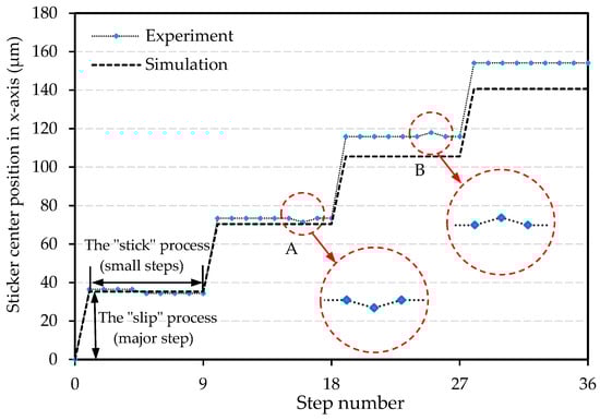 In this experiment, 400 complete displacement sequences along the x-axis direction (“slip” to “stick” process) were realized. It can be observed in Figure 13 that the trajectory of the plate in the x-axis direction is almost linear with the increase in sequence number from 0th to 164th (Point a to p). The difference between the average SSD value 37.44 μm and the origin SSD value (40.88 mium) is only 3.44 μm (8.4%); this zone (from a to p) can be determined as the stable zone (SZ). The experimental results and simulation results are almost consistent in the SZ. It can also be observed in the sticker position pictures presented in Figure 14 that after 150 plate displacement sequences in the x-axis direction, the y-axis direction of the plate offset is −175 μm, which is just about four-times the SSD value in the x-axis direction. It is then proved that the plate displacement linearity is quite good when driven in the x-axis direction in SZ. The simulated displacement trajectory curve was also found close to the experimental displacement trajectory curve. The dynamic model offers great accuracy under the above driving conditions.