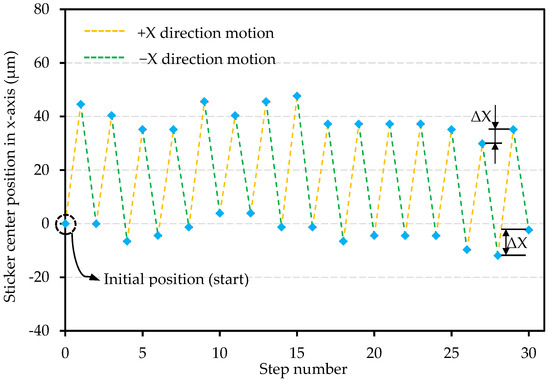 In this section, a study on the repeatability of the “Slip” process is presented. The objective of this study is to verify the repeatability of the plate SSD value which is important for the conveyance application. A 5A pulse current was used during this experiment because it can output the maximum SSD and is consistent with previous experiments. During this experiment, the plate was first driven to output an SSD along the +x axis and then the plate was driven to output a SSD along the −x axis. This driving process (defined as forth and back process) was repeated for 30 times; the eight small steps in the “stick” process were not implemented. The plate position along the x-axis is shown in Figure 11. The difference (ΔX) (shown in Figure 11) between the plate current position and the previous position was taken as a repeatability criterion to evaluate the repeatability of the “slip” process SSD. It can be observed that the average SSD value is 41.80 μm and 41.92 μm along the x+/− directions, respectively. The real standard deviations of the SSD value along the two directions are 3.75 μm and 3.70 μm, respectively.