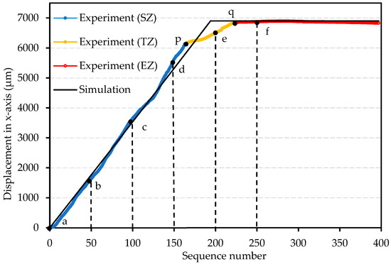 After the 220th sequence (Point q), the experimental displacements of the plate are about 0. As it has been observed in experiments, the conveyed plate was already removed from the boundary of the actuators. Several MPMs already lost contact with the plate, which is the reason why the plate ceased to move. This zone after Point q can be defined as the end zone (EZ). The maximum range of the device can be limited to 6880 μm.