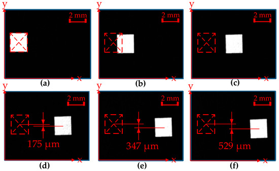 Sticker position in pictures with difference displacement sequences along x-axis. (a) The initial position. (b) The 50th displacement sequence. (c) The 100th dis-placement sequence. (d) The 150th displacement sequence. (e) The 200th displacement sequence. (f) The 250th displacement sequence.