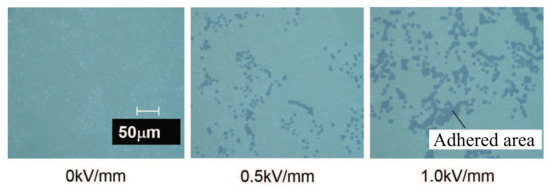 EA gel is a functional material made by dispersing dielectric polymer particles in insulating oil such as silicone oil and gelating them. An EA particle is an organic–inorganic composite particle with an acrylic core covered with a titanium-oxide or tin-oxide film and has an average diameter of 16 μm. One type of EA gel is formed into a sheet as in Figure 1 by increasing the hardness of the gel component and has a property called the “electro-adhesive (EA) effect” [8]. The EA effect has a different mechanism from that of the ER fluid effect [21], as shown in Figure 2. An EA gel sheet is attached to one (bottom) electrode, and the counter (top) electrode is placed on the EA gel. When no electric field is applied, the dielectric particles with low frictional resistance protruding from the gel surface support the counter electrode and make the adhesive force weak. When an electric field is applied, the particles attract each other and push the gel outward, and the gel rises owing to the electric force at the interface. As a result, the gel component occupies a higher percentage of the surface of the EA gel, and the adhesion to the counter electrode increases. Figure 3 shows the EA gel observed through a transparent electrode plate [8]. The area adsorbed on the electrode surface increases as the applied electric field increases.