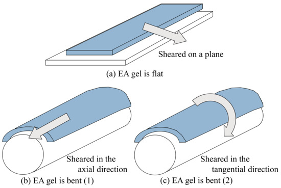 The EA gel has a certain degree of flexibility and can be curved. Figure 4 shows the classifications for the sheared and curved directions. EA gels are assumed to be bonded to the counter electrode. Conventionally, the EA gel (or counter electrode) is sheared in a plane, as shown in (a). In contrast, there are two cases where the electrode and EA gel are both on a curved surface such as a cylindrical surface. The shear is in the axial direction in Case (b) and in the tangential direction in Case (c).