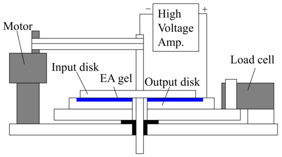This section corresponds to Figure 4a. Figure 5 is a model diagram of a clutch using EA gel for the sliding surface [10]. The input shaft attached to the input disk is driven by a motor. The output disk is connected to the load (in this case, a load cell). An EA gel sheet like that in Figure 1 is fixed to the output disk and has a thickness of about 0.5 mm. Both disks are made of aluminum, are about 5 mm thick, and serve as electrodes. The shear stress on the EA gel surface and the transmitted torque increase as the electric field increases. The relationship between the transmitted torque and shear stress can be written as