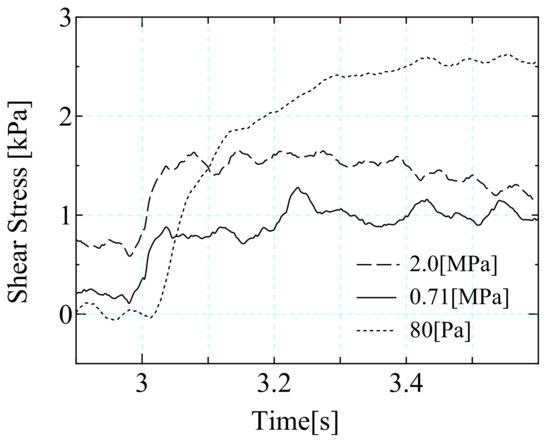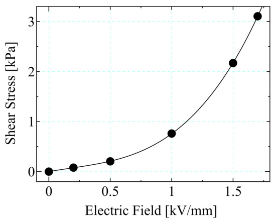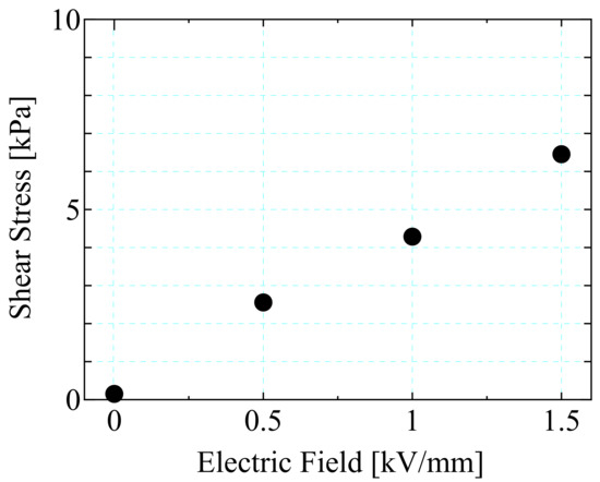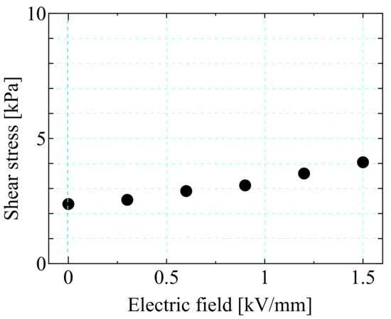 Figure 11 shows the experimental results. Note that the shear stress measured by the load cell was higher than the original shear stress because the force measured by the load cell included the partial force that pulled the electrode sheet towards the axis of rotation. The shear stress increased with the strength of the electric field, but the increment was small and the value was large even with no electric field.