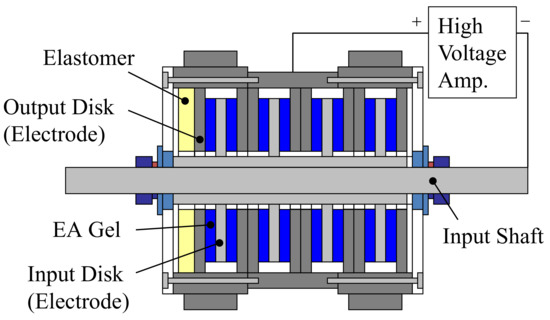 Figure 7 is a model diagram of the clutch in the horizontal position with multiple EA gel sheets [13]. The input and output disks were cut with spline grooves to allow motion along the input shaft and output cylinder. The thickness of the disks was reduced to 0.5 mm to allow a high deformation capacity and to improve contact. A surface pressure of about 0.5 kPa was applied by pressing the disk against a low-modulus elastomer at the edge.