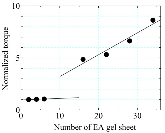 Figure 8 shows the different output torques for different numbers of EA gel sheets in the clutch of Figure 7 [13]. An electric field of 1.5 kV/mm was applied. The torque was normalized for the torque of two EA gel sheets, and the actual torque was 24.6 Nm when 34 gel sheets were installed. The shear stress per gel sheet was 16.3 kPa.