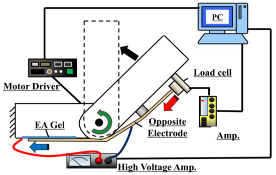 This section corresponds to Figure 4b. Figure 9 is a photograph of the experimental setup, and Figure 10 is a diagram of the principle [15]. An electrode sheet and an EA gel sheet were attached in this order to the side of a cylinder with a radius of 40 mm, which was fixed to the wall. The fore-cylinder was connected to the motor at the joint and was driven by commands from the PC. The counter-electrode sheet, which was connected to a load cell fixed to the fore-cylinder, was lightly pressed and fixed with a cuff to the EA gel on the wall-side cylinder. As the fore-cylinder rotated, the counter electrode slid on the EA gel in the direction of the cylinder axis, and the braking force generated between the counter electrode and the EA gel was measured by the load cell. The EA gel was modified to have a tougher surface, and the shear stress was assumed to be slightly lower than in the previous section, approximately 5–8 kPa.