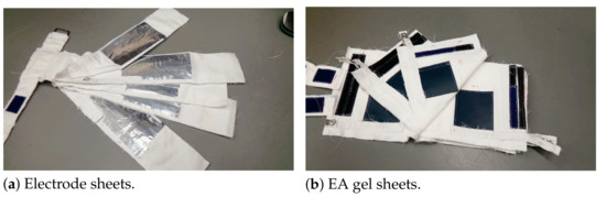On the basis of the results above and in the previous section, a new multi-layered EA gel and electrode sheets were developed to improve the shear stress and increase the braking force by stabilizing the surface pressure. As shown in Figure 12, the electrode sheets (a) and EA gel sheets (b) were alternately stacked, and the number of EA gel sheets was increased from 1 to 10. The results are shown in Figure 13. As the number of EA gel sheets increased to seven, the shear stress increased with no electric field, but decreased under an applied electric field. However, when 10 sheets were used, both the shear stress without an electric field and the enhanced shear stress with an applied electric field decreased. The 10-sheet layered EA gel was thicker, making it more difficult to roll with the cuff. However, if the cuff was rolled more tightly, the initial surface pressure on the EA gel was considered to be excessive. The cuff was rolled weakly with this in mind, but it might have been too soft, resulting in insufficient contact.