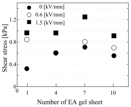 There was little change in torque with up to 10 EA gel sheets, but roughly linear increments in torque can be seen when the number of gel sheets was over 10. Although the electric field was lower than that in Figure 6, the shear stress was more than 10-times higher, and more than expected. This can be attributed to the following reasons: Because of the low surface pressure, the contact between the EA gel and the electrode plate was insufficient for a small number of sheets, and the variation in surface pressure became large. However, the contact when applying the electric field was improved because of the high deformation capacity and mobility of the EA gel and the electrode plate.