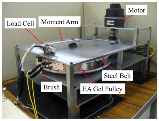 This section corresponds to Figure 4c. Figure 14 is a photograph of the experimental apparatus, and Figure 15 is its principle diagram [12]. The apparatus was a flat-belt-drive system in which the transmission torque can be controlled using an electric field applied to the EA gel. A motor was connected to the driving pulley, and the electrode sheet and the EA gel were attached to the side of the driven pulley, which had a radius of 150 mm. The flat belt was made of steel and served as a counter electrode. The contact pressure between the belt and the pulley was generally not constant on the driven pulley, but was highest around the opposite side of the driving pulley. For this reason, the initial tension of the belt was kept quite low in this apparatus, while the slippage between the belt and the driving pulley was reduced by idlers and sprockets. The EA gel used in this apparatus had properties intermediate between those in Section 3 and Section 4.
