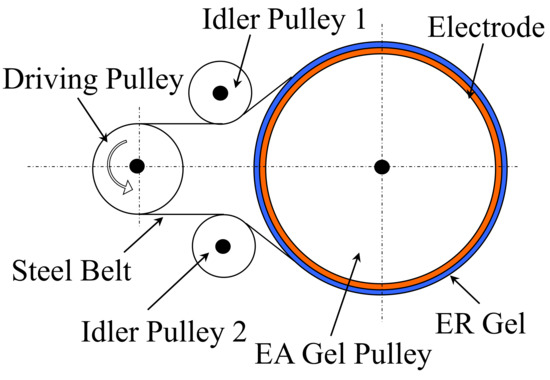 - Koyanagi, K.; Dohi, M.; Kakinuma, Y.; Anzai, H.; Sakurai, K.; Motoyoshi, T.; Oshima, T. Controllable Belt Drive System Using ER Gel. In Proceedings of the 13th International Conference on New Actuators, Bremen, Germany, 18–20 June 2012; pp. 85–88. [Google Scholar]