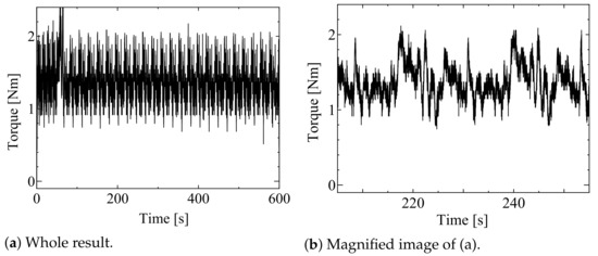 In a new experiment, the torque was measured for 10 min while an electric field of 0.5 kVmm was applied. The results are shown in Figure 17a. The torque showed oscillations with an amplitude up to 0.5 Nm, which appeared to be a combination of several modes. A magnified image is shown in Figure 17b. The vibrations with the shortest period were electrical vibrations and mechanical vibrations of the sensor, the belt, and the mechanical structure. The longest oscillations had a period of 225–247 s, which corresponds to the period of the belt’s revolution. The longest-period oscillation had the highest torque variation. This is because the joint of the steel belt passes through characteristic points such as the idler and the beginning of the winding with each pulley [11]. In other words, the surface pressure on the EA gel around such points was reduced because a part of the steel belt around the joint was warped in the lift-off direction of the EA gel, which reduced the shear stress, especially on the slack side of the belt. As the joint moved towards the tight side of the belt, the contact was restored and the shear stress increased owing to the increased pressure of contact of the belt with the EA gel pulley. Vibrations corresponding to the belt rotation period were generated by repeating this process.