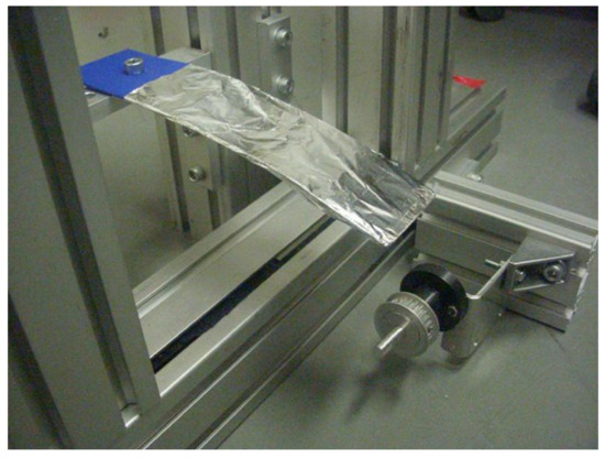 As mentioned in the previous section, applying appropriate pressure between the EA gel and the counter electrode is important in using shearing EA gel. The shear direction and the normal direction of the EA gel surface ideally intersect perpendicularly in all cases, as shown in Figure 4, so the appropriate surface pressure can be applied continuously. However, in real construction, the large curvature in Cases (b) and (c) causes variation in the surface pressure. Particularly in Case (c), when a tensile load is applied to the EA gel to make it shear, the surface pressure will vary if the load is not exactly in the tangential direction. Tensile loads are also applied from both sides to maintain the winding of the belt when applied to the belt–pulley system mentioned in Section 5. Even if each side tension is acting exactly tangentially, the surface pressure will vary along the surface of the EA gel.