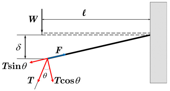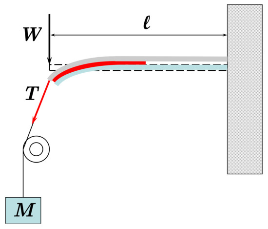 The shear stress at the surface of the EA gel can be calculated as follows. First, the upper and lower plates and the EA gel were considered as a single beam. We also assumed that the slope was constant and the shear stress on the EA gel was uniform on the plates. The experimental conditions in this case can be approximated as in Figure 20. The load W (N) acting on the tip of the plate is the normal component of the string tension T (N); thus, from the figure. Assuming that the upper plate was made of sufficiently soft rubber, the Young modulus of the lower plate was N/mm2, the area moment of inertia was mm4, and the length of the plate was mm. While the deflection (mm) was not small, for simplicity, it was approximated using the following general formula for deflection: