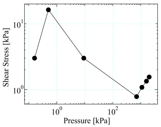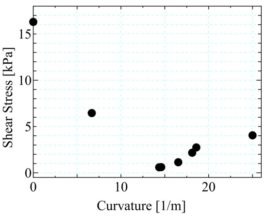 Figure 22 summarizes the experimental results for curvature and shear stress. The shear stresses in Section 3, Section 4 and Section 5 are shown for an applied electric field of 1.5 kV/mm. For Section 6, the shear stresses in the respective electric fields were taken to be equivalent to 1.5 kV/mm using Figure 16. The figure shows that the shear stress decreased with increasing curvature from the plane and gradually increased from approximately 14 . This means that as the curvature increased, the shear stress decreased owing to the inability to provide a suitable constant surface pressure. However, a strong electric field was applied when the curvature was even greater, which stabilized the adsorption state and increased the shear stress, especially in Section 6. This result means keeping an appropriate EA gel surface pressure is more important than the curvature itself. From this viewpoint, the relationship between the pressure on the EA gel surface and the shear stress in the paper is shown in Figure 23 as a double logarithmic graph. The best point was at approximately 0.5 kPa. The shear stress increased for higher surface pressure, but the shear stress also increased without an electric field, so the effective shear stress was not high.